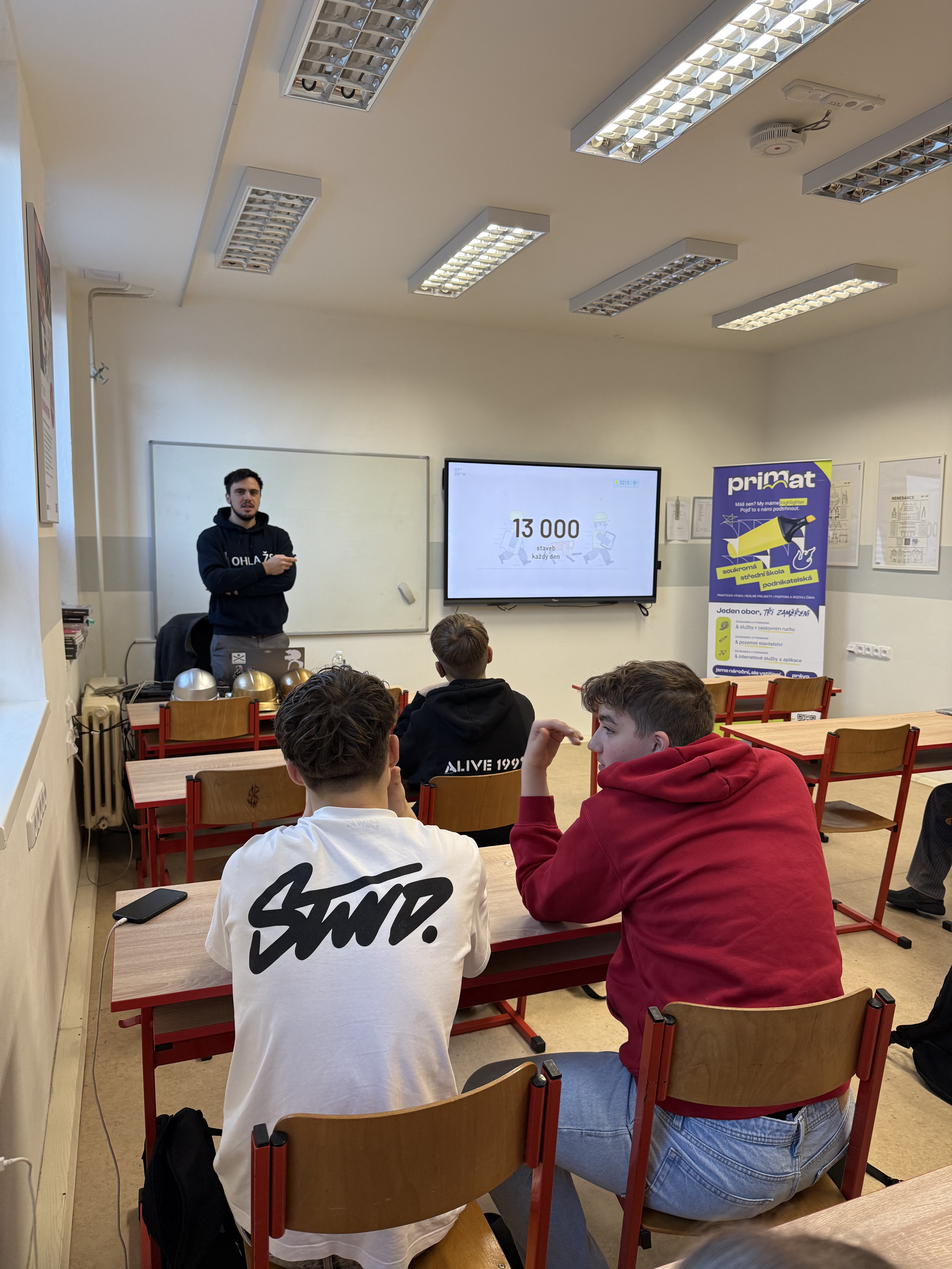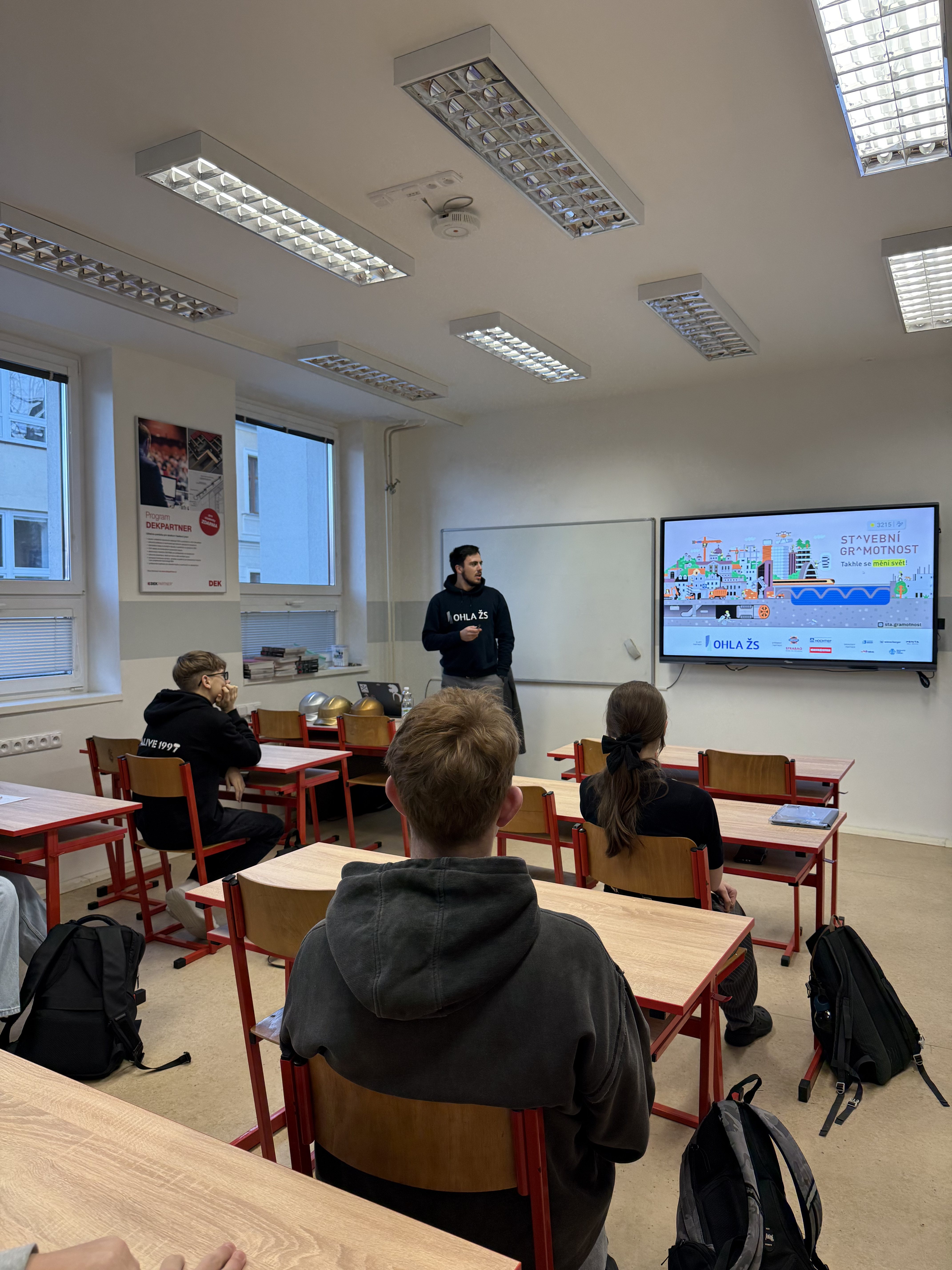 Studenti 1. ročníku zaměření na pozemní stavitelství se zúčastnili odborné přednášky na téma stavební gramotnost, kterou vedl Jan Vondráček, studenta VUT a mistr ZŠ OHLA. Cílem setkání bylo přiblížit žákům, jaký význam má stavebnictví v dnešním světě, jak funguje v praxi a jaké je jeho postavení v České republice i v zahraničí. Během přednášky se žáci seznámili se základními principy stavebnictví, jeho dopadem na každodenní život i s aktuálními trendy v oboru. Výklad byl doplněn názornými videi, která představila moderní stavební technologie, inovativní postupy a možnosti dalšího vývoje odvětví. Díky tomu měli studenti možnost nahlédnout do stavebnictví nejen z teoretického, ale i velmi praktického hlediska. |